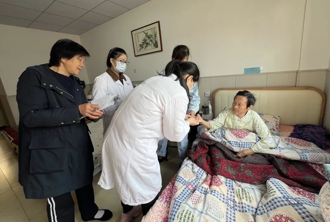 黎珍妹护士长带领护理团队为失能老人进行床边护理查房,亲切地询问老年人的身体状况,有针对性地进行护理指导,针对生活不能自理、存在严重健康问题的老年人,向养老院负责人详细询问病情,了解既往病史及近期治疗方案,全面查体,提供个性化的健康指导。